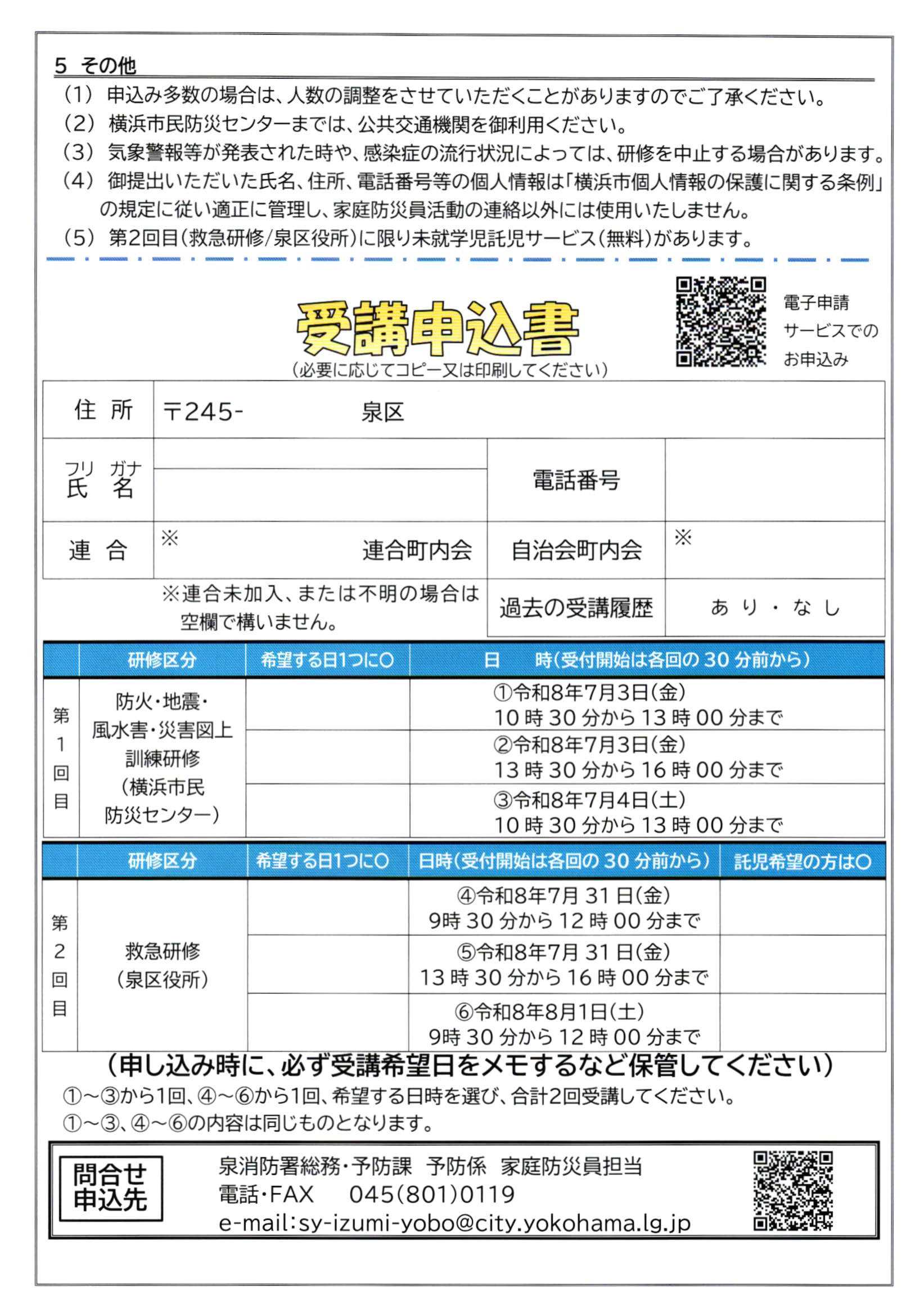 泉区家庭防災員研修 受講申込書(6月12日(金)まで)
