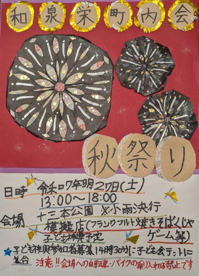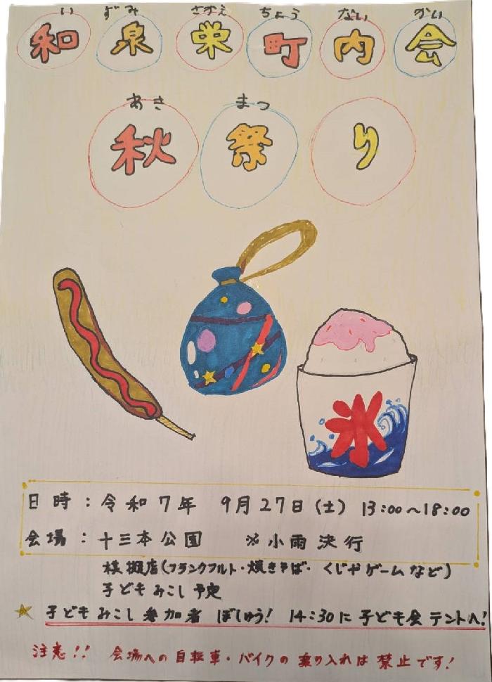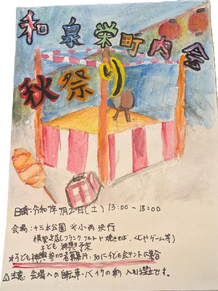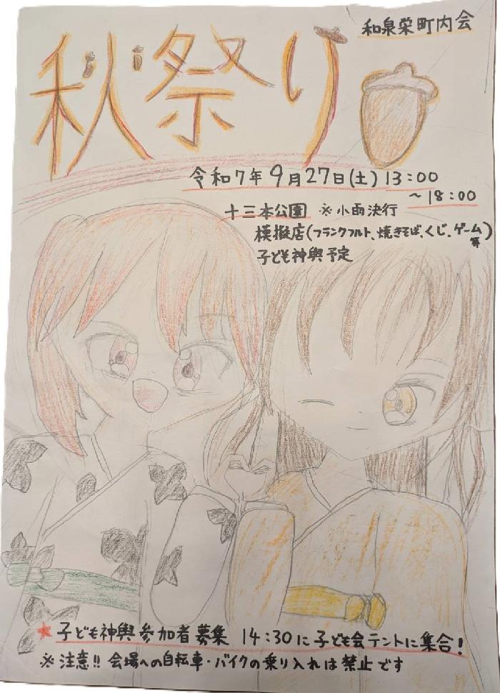町内会秋祭り告知のため、子どもたちにポスターを描いてもらいました!どれも力作です!町内7つの掲示板に掲示させてもらいます。