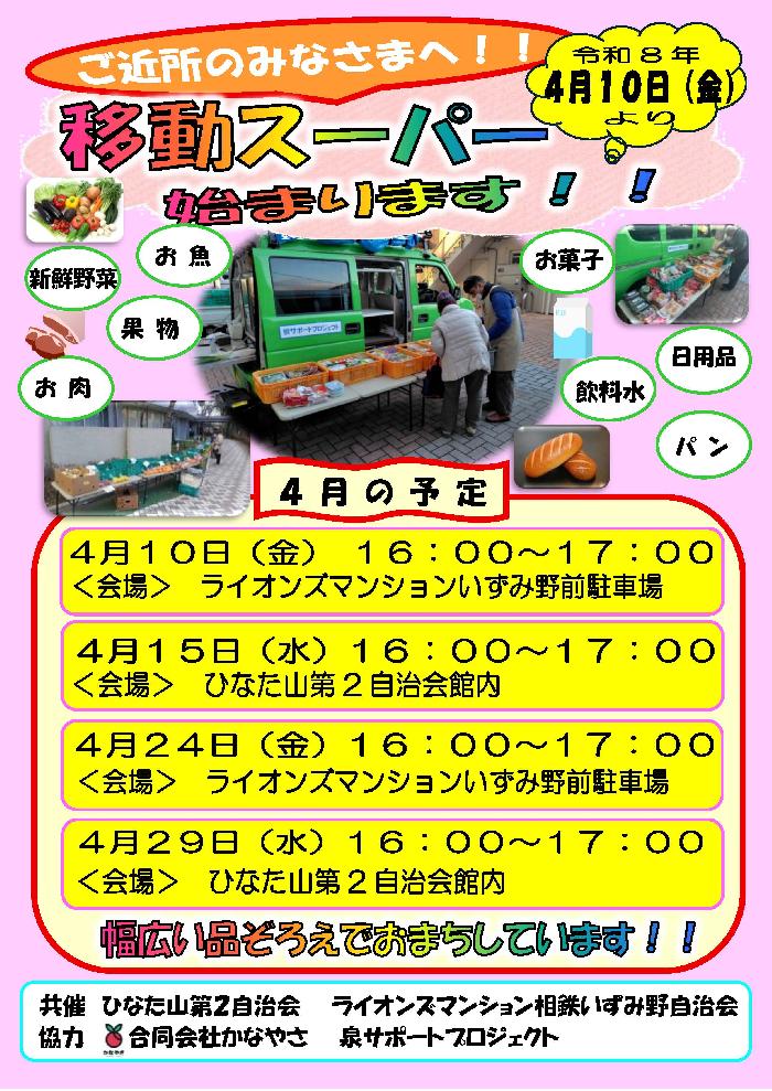 ひなた山第2自治会、ライオンズマンション相鉄いずみの自治会共催で移動スーパーを始めます。