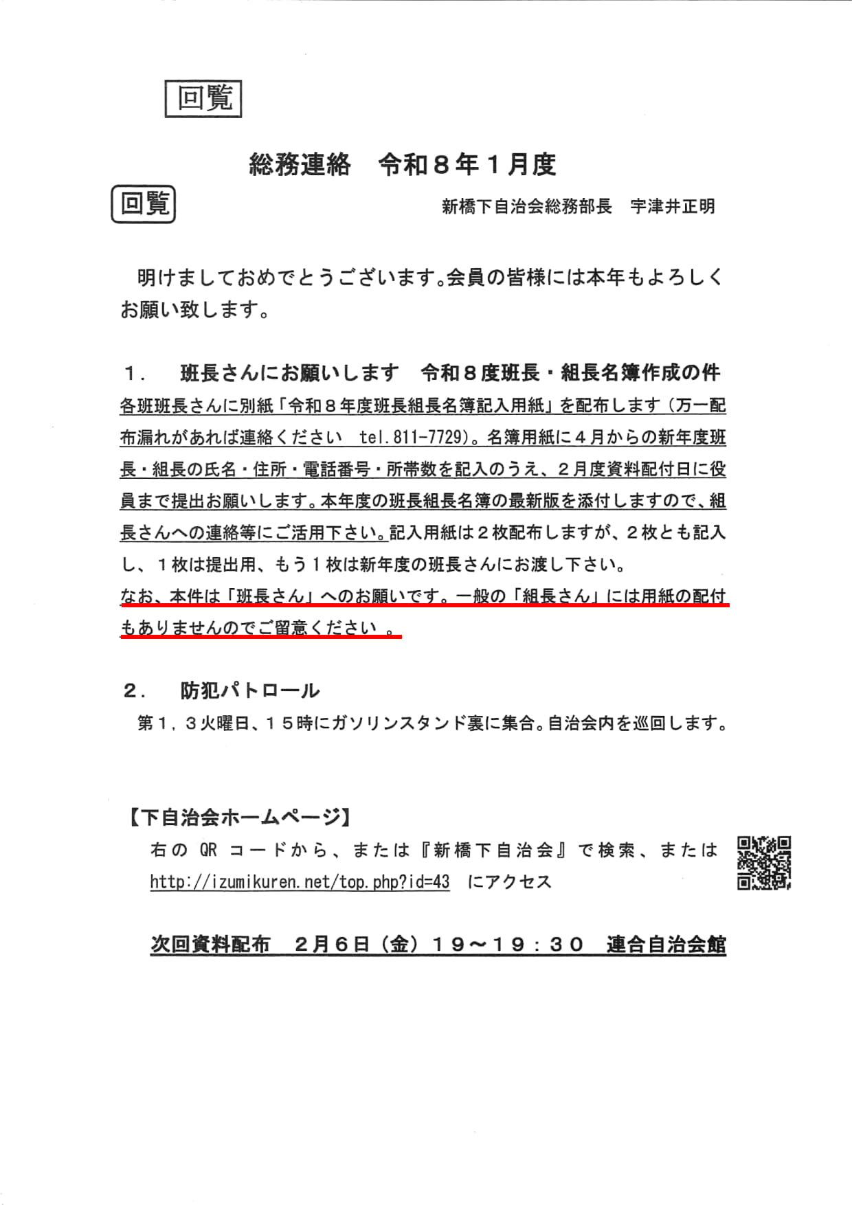 今月の総務連絡/班長・組長名簿作成、防犯パトロール