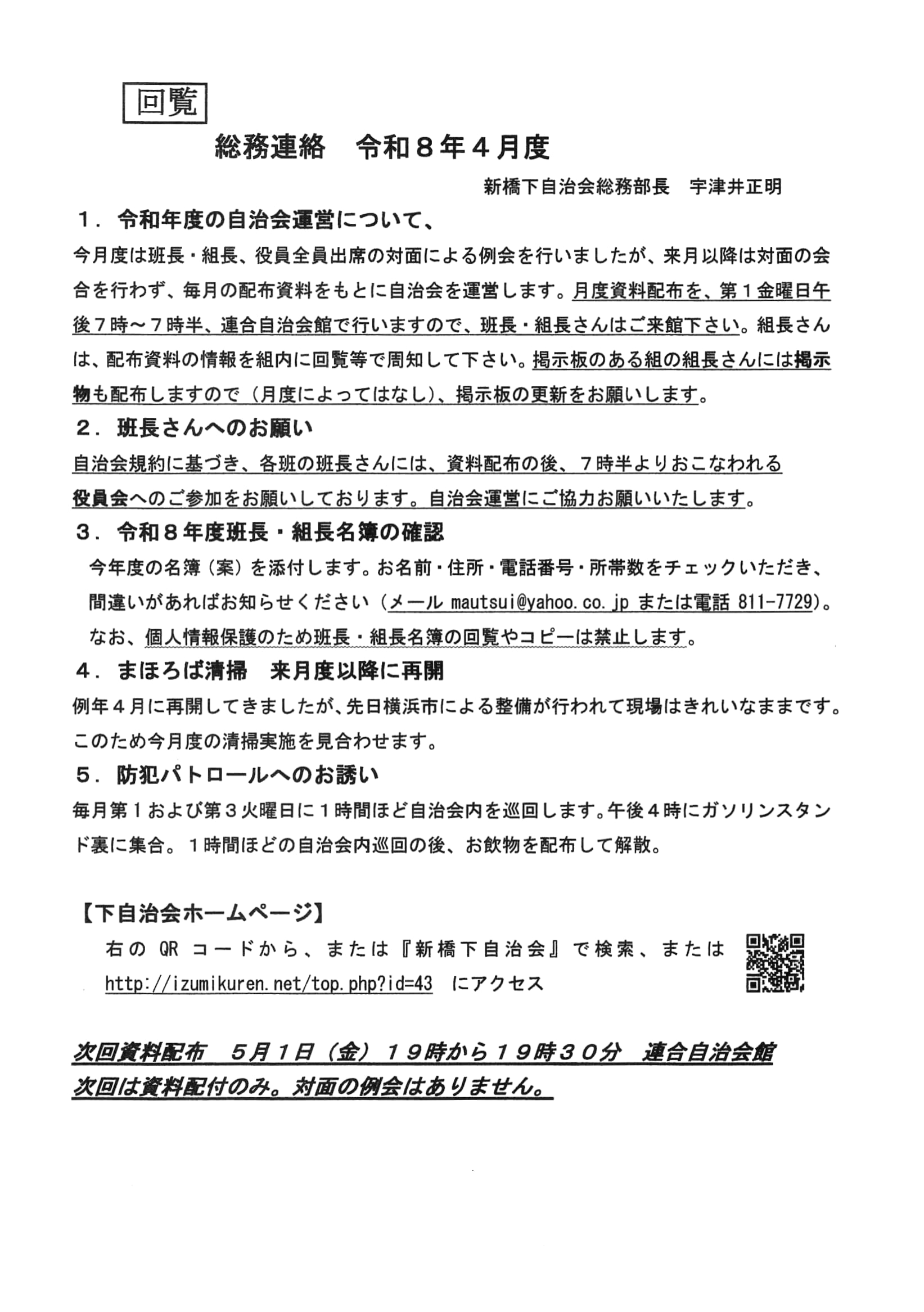 今月の総務連絡/令和8年度の自治会運営について、まほろば清掃、防犯パトロールほか