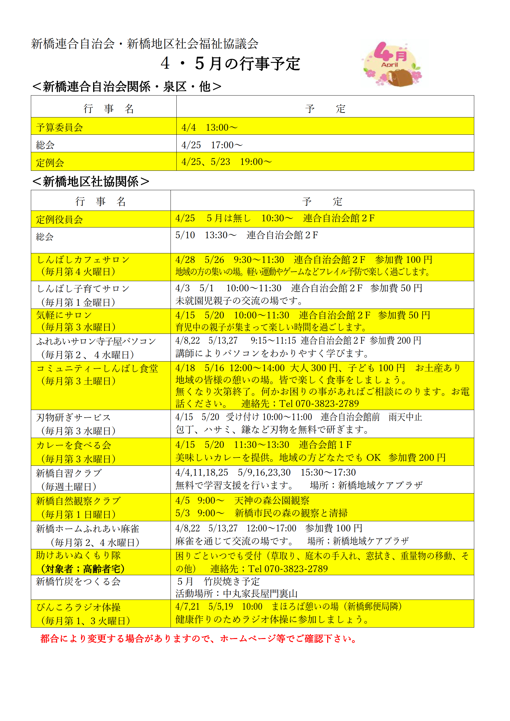 4月・5月の行事予定/新橋連合自治会・新橋地区社会福祉協議会