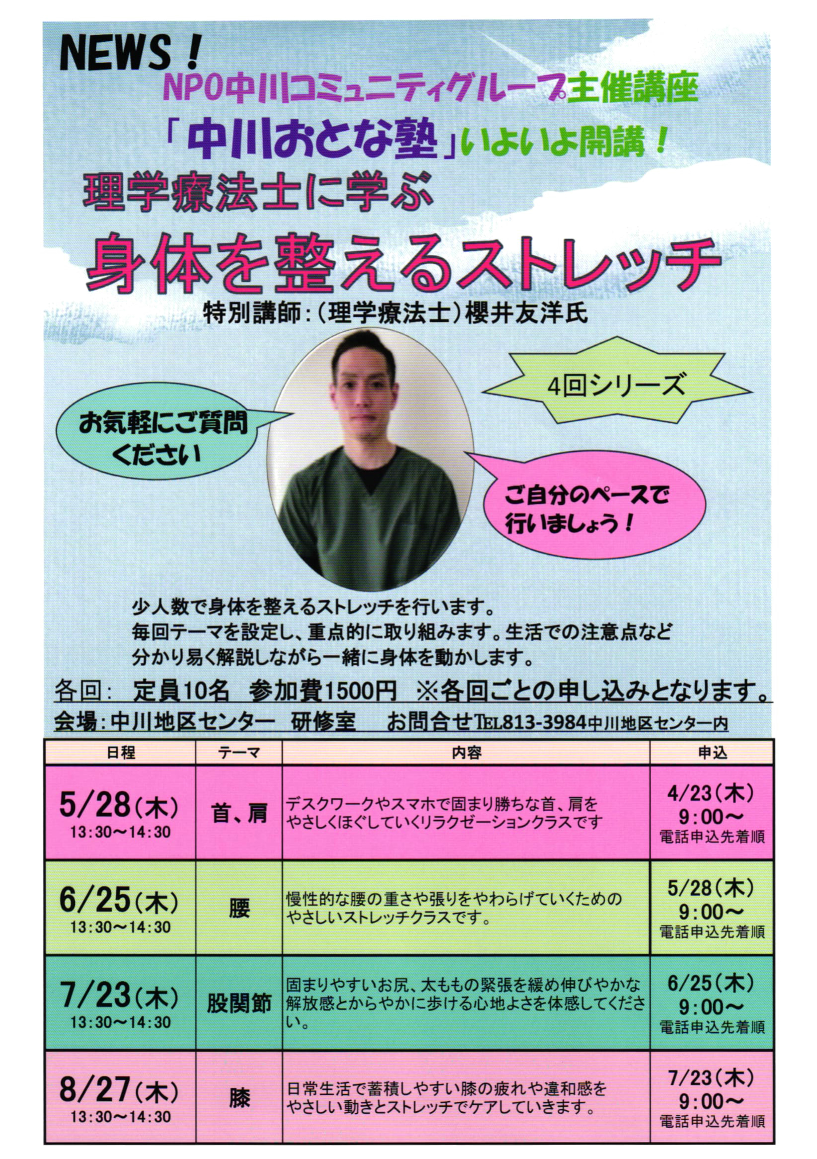 身体を整えるストレッチ:5月28日(木)、6月25日(木)、7月23日(木)、8月27日(木)
